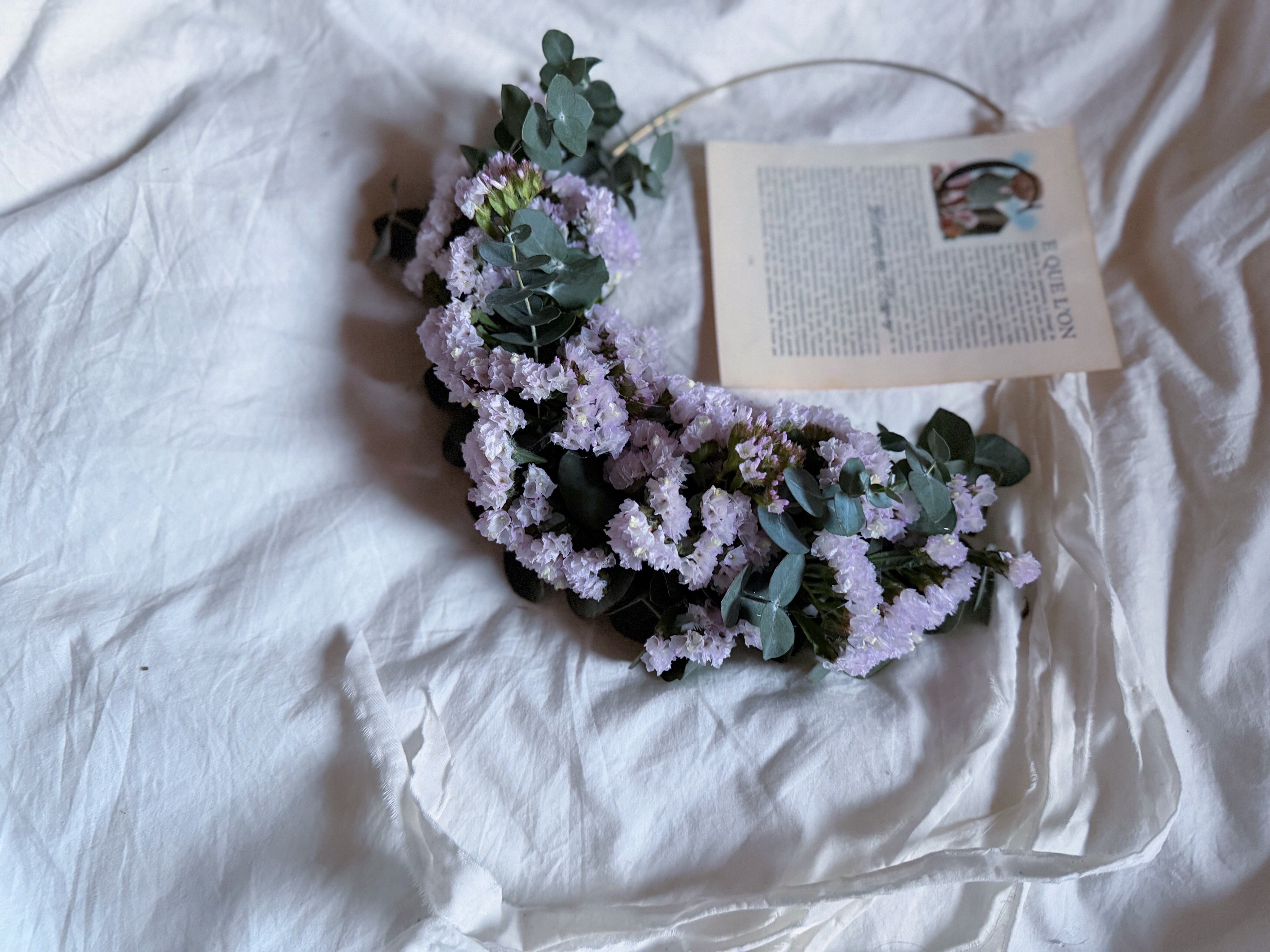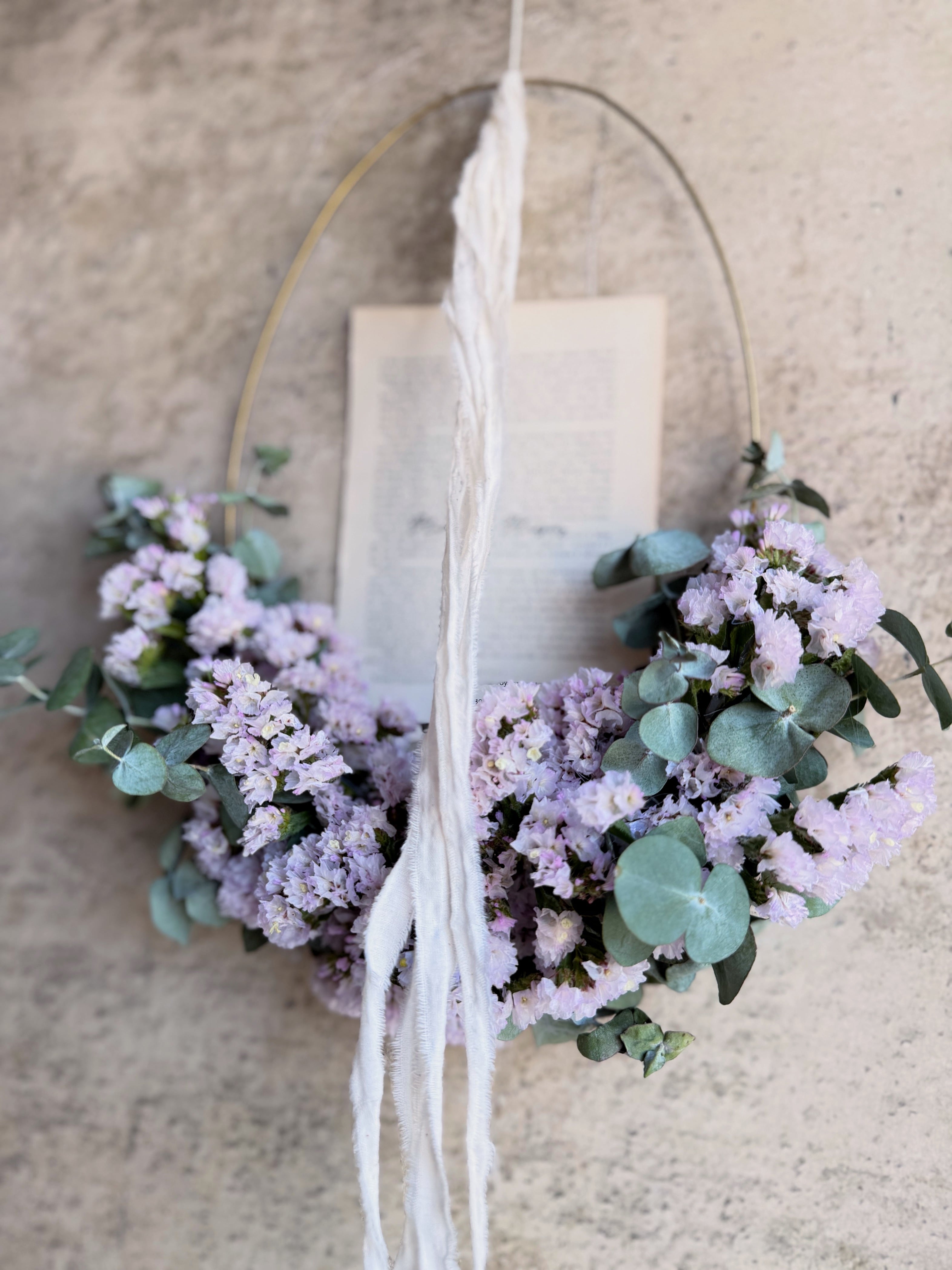 今回は、淡くやわらかな春色の花々で仕立てた小さなブーケと、真鍮のオーバルフレームにデザインしたオーバルリースをご用意いたしました。