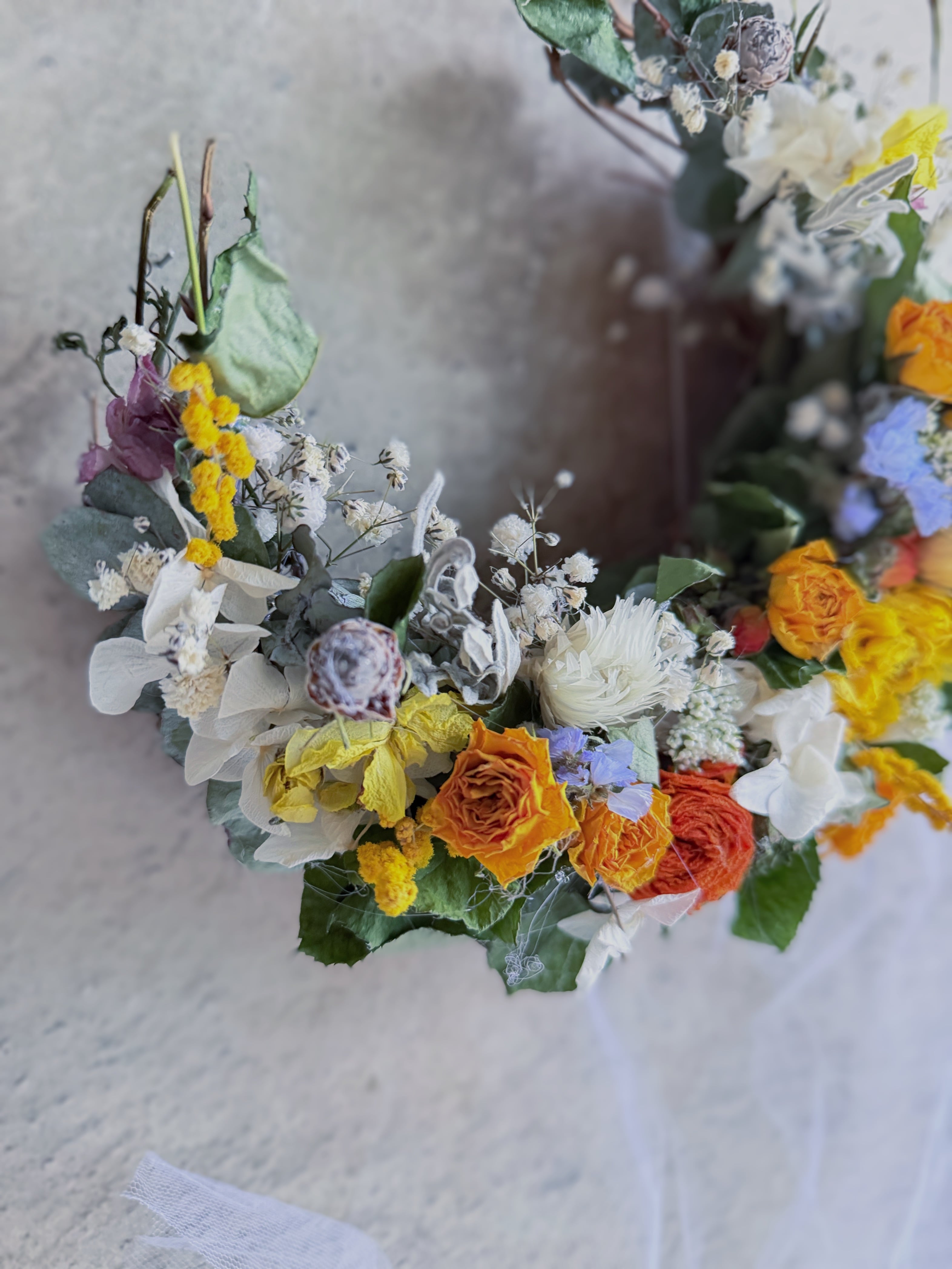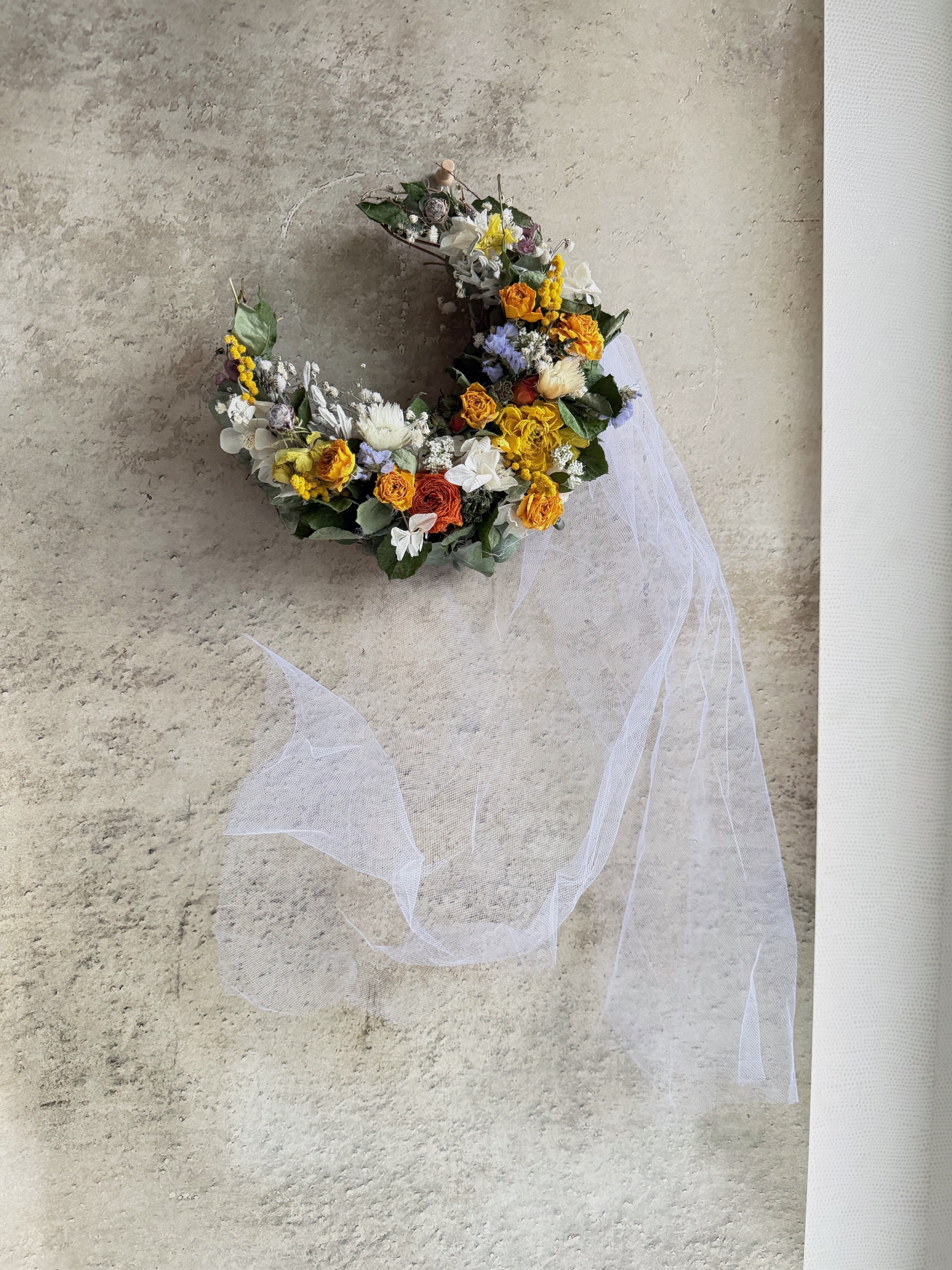 季節の花々で彩る月のリース。新たな人生のスタートに相応しく、明るく輝かしく前向きに歩んで行けますようにと、見守る明るく照らす月のリースをデザインさせて頂きました。今までの労いや感謝の気持ち、贈る方の思いと贈られる方への思いも込めて贈ります。オーダーありがとうございました。